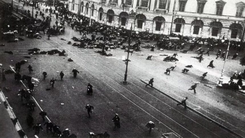 1917: [OS Oct 24] Bolshevik revolution begins with bombardment of the Winter Palace in Petrograd during the Russian October Revolution