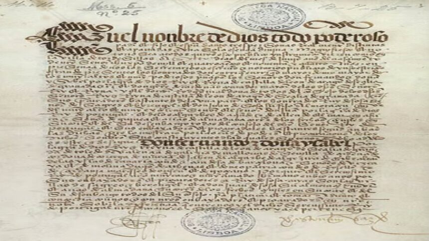 1494: Treaty of Tordesillas: Spain and Portugal divide the new world along a meridian 370 leagues west of the Cape Verde islands, off the west coast of Africa