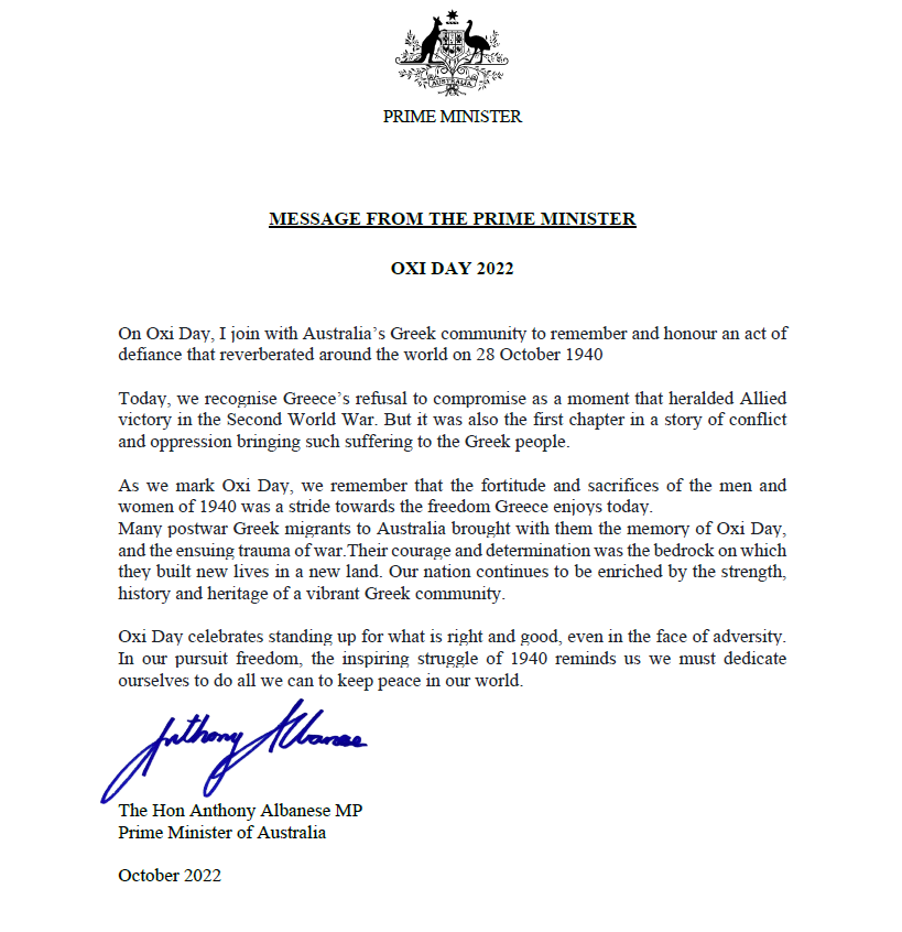 Australia’s Prime Minister, Anthony Albanese, has joined the Greek community today in honouring the 82nd anniversary of Greece’s National Day (OXI Day).