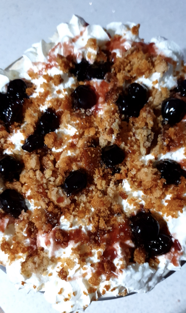 - Add the koulouria biscuits around like a flower. Break pieces to fill in any spaces. Push into cream base so they don’t float up when you add the jelly mix to set.