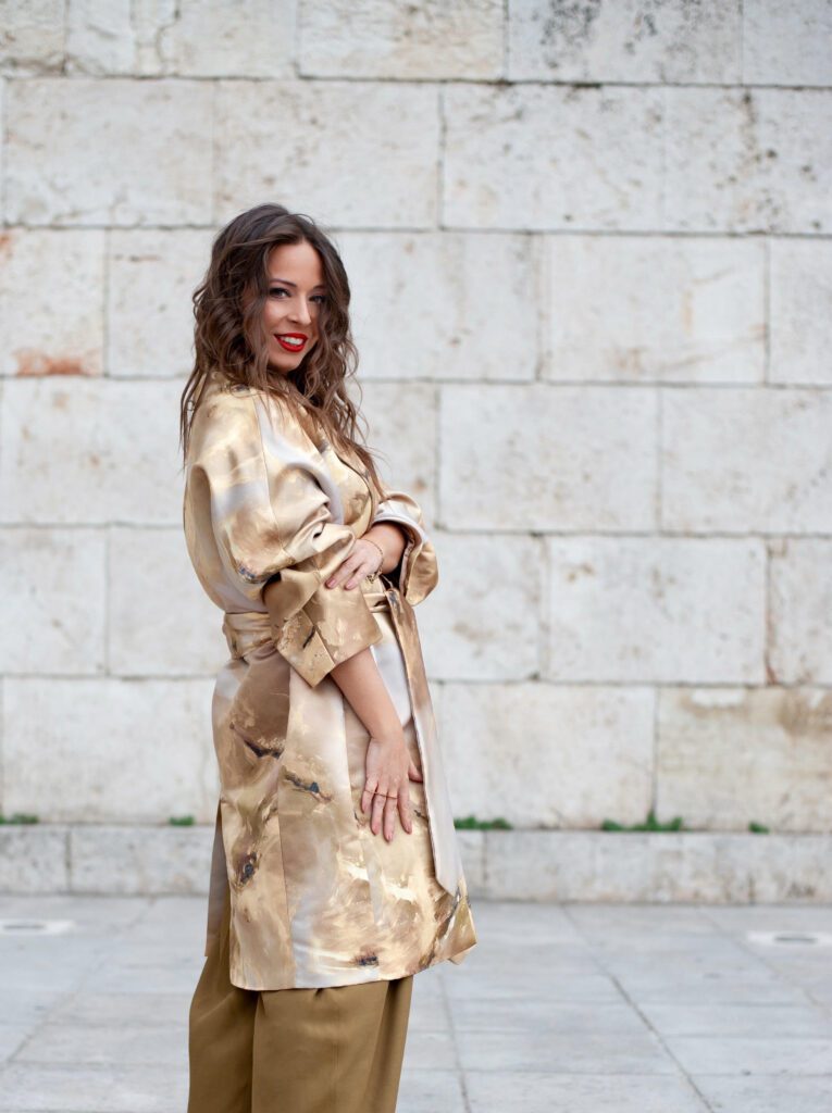My journey as an artist began with a profound love for painting and a deep appreciation for colour and form. After years of experimenting with various mediums, I found myself irresistibly drawn to fashion as a form of expression but as a canvas for my art. I envisioned creating wearable pieces that allow individuals to carry a fragment of my creativity with them. The vibrant colours and intricate designs of my paintings inform my clothing line, fostering a dialogue between the two. I aimed to address a common challenge: the feeling of having “nothing to wear.” My pieces are designed to make everyday moments special, allowing one to feel extraordinary in their daily routine, whether dressing elegantly for a gala or simply wanting to stand out in a crowd in a daily routine. While monochrome outfits often provide comfort, they can sometimes lean towards the mundane. I sought to infuse creativity into every aspect of dressing, as it is an essential part of our lives. Plus, I love exploring new horizons and pushing my boundaries.