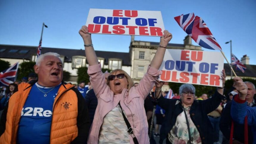 © Thomson Reuters Loyalists protest against the Northern Ireland Brexit protocol at Belfast Harbour Estate, in Belfast, Northern Ireland, July 3, 2021. REUTERS/Jason Cairnduff