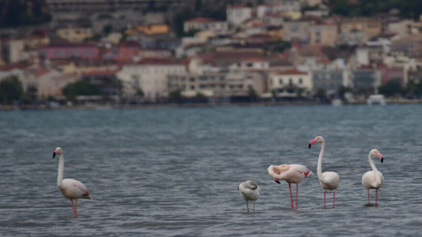 A flock of flamingo birds rest at the Nea Kios coastal wetland near the port of Nafplio in the Peloponnese on Saturday.