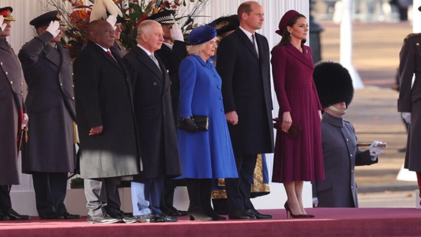 The Prince and Princess of Wales were part of events for the first time, travelling to Mr Ramaphosa’s luxury hotel in nearby central London and accompanying him to Horse Guards Parade for the start of the ceremonial welcome.