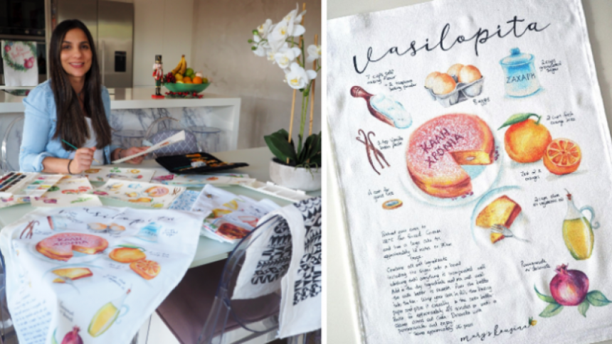 “I’ve created a synergy between art and food by painting my recipes, illustrating them and printing them onto cotton and linen tea towels,” Mary tells The Greek Herald exclusively.