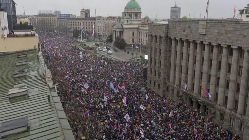 Thousands of protesters have fallen silent in Serbia’s capital on Saturday, to honour the victims of a concrete awning collapse which has sparked significant unrest in the country.