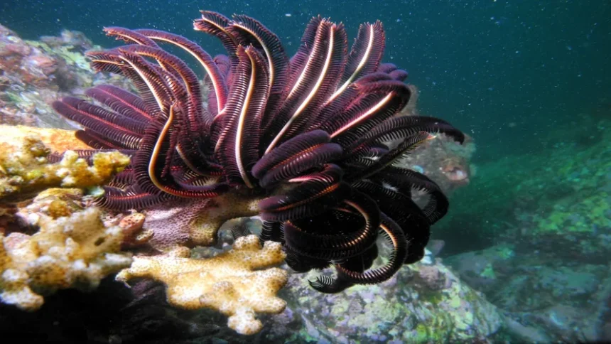 These animals belong to a group called crinoids, and if a crinoid doesn’t have a stalk, it is classified as a feather star. What sets this species apart is the number of arms it possesses, which is different from the norm. Most other members of this family typically have around five arms.