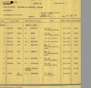 Although local people continued to care for Fred’s grave throughout the war, unfortunately, when his body was recovered by the British Army in 1946 it proved impossible to reconcile all the records. His remains were exhumed and he was buried at Heverlee War Cemetery, Leuven as an “unknown soldier.”